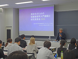 このプログラムは、高校生の皆さんによる自主研究をポスター発表形式でプレゼンテーションしていただく研究発表会と、数理的視点を自然や社会の理解に活用する面白さを本学教員が講義形式で伝える入門講座の2部構成となります。昨年も全国から多くの高校生の皆さんにご参加いただき、活気ある研究発表の場を提供することができました。